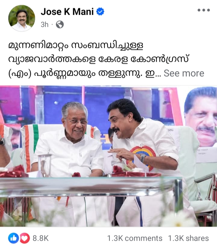ജോസ് കെ മാണിയുടെ പോസ്റ്റിന് ഇപ്പോൾ തന്നെ ആയിരത്തിലധികം ഷെയറുകളും കമൻ്റുകളുമാണ് ലഭിച്ചിരിക്കുന്നത്.